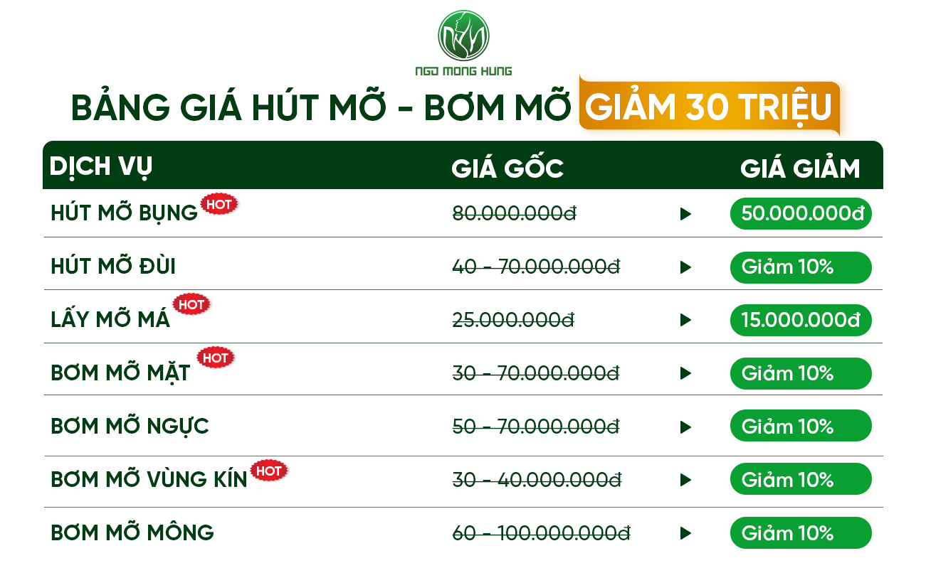 Chi phí hút mỡ đùi hết bao nhiêu sẽ tùy theo từng cơ sở thẩm mỹ, thường dao động trong khoảng từ 20.000.000 – trên 100.000.000đ. Dưới đây là bảng giá hút mỡ đùi tại Bệnh viện Thẩm mỹ Ngô Mộng Hùng: