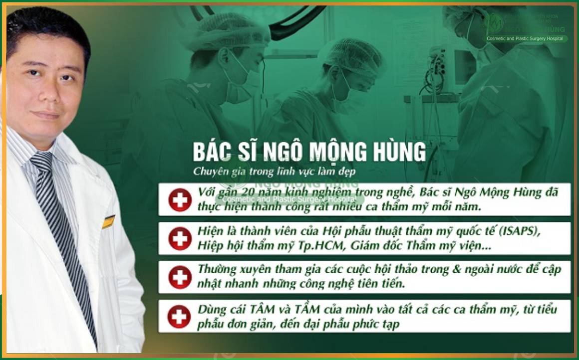 Bác sĩ Ngô Mộng Hùng là một trong những bác sĩ có bề dày kinh nghiệm lâu năm trong ngành phẫu thuật thẩm mỹ. Hiện tại, Bác sĩ Hùng đã có hơn 20 năm kinh nghiệm trong ngành, giúp khách hàng hoàn toàn an tâm khi trao gửi nhan sắc. Lý lịch của bác sĩ Ngô Mộng Hùng cũng vô cùng chói sáng: Tốt nghiệp chuyên ngành phẫu thuật thẩm mỹ và từng đi tu nghiệp nhiều năm tại các nước có nền thẩm mỹ phát triển vượt trội như Hàn Quốc, Hoa Kỳ, Thái Lan…