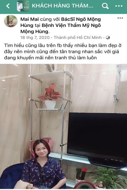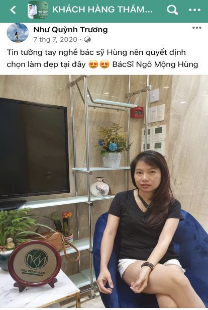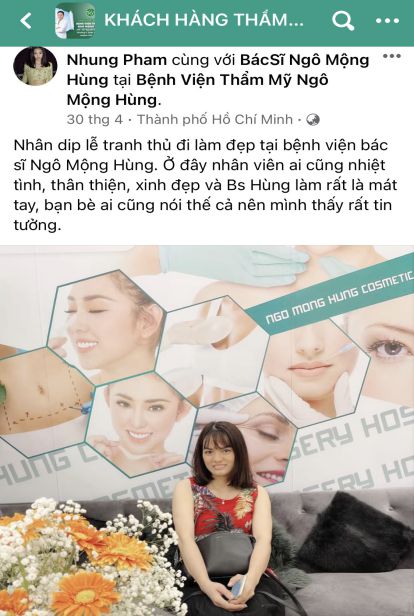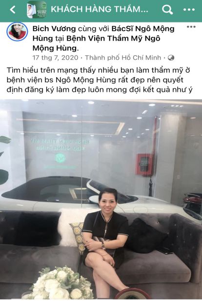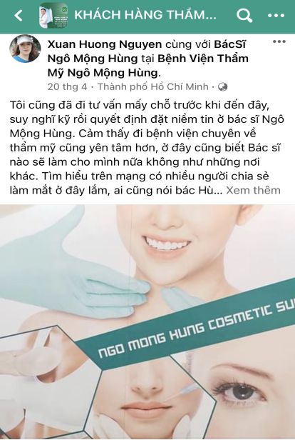 Đến với Bệnh viện thẩm mỹ Ngô Mộng Hùng, khách hàng sẽ nhận được sự hài lòng nhất, từ khâu tư vấn, chăm sóc khách hàng đến hiệu quả sau phẫu thuật. Chúng tôi có đội ngũ Bác Sĩ và ekip làm việc chuyên nghiệp, tận tâm. Sau khi đạt được kết quả như mong đợi, rất nhiều khách hàng đã tin tưởng và giới thiệu người thân đến Bệnh viện để làm đẹp. Cùng xem qua một số phản hồi của khách hàng cũ để hiểu hơn về chúng tôi nhé.