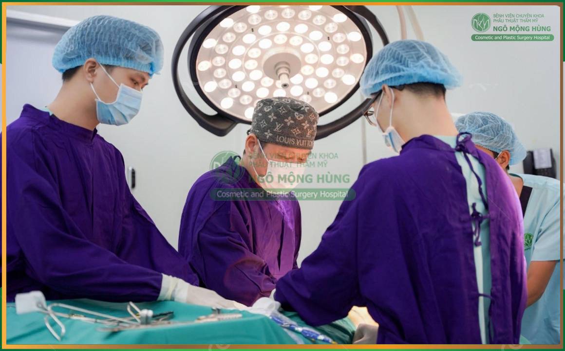 Bác sĩ Hùng sẽ rạch một đường nhỏ trong khoang mũi, thông qua đó tiến hành đặt sụn để nâng sống mũi, dựng trụ và tạo chóp nhô. Tiếp đó, bác sĩ Hùng sẽ điều chỉnh dáng mũi thành đường thẳng dứt khoát, tạo hình chữ L rõ nét. Cuối cùng bác sĩ khâu vết thương lại bằng chỉ thẩm mỹ để hạn chế sẹo.