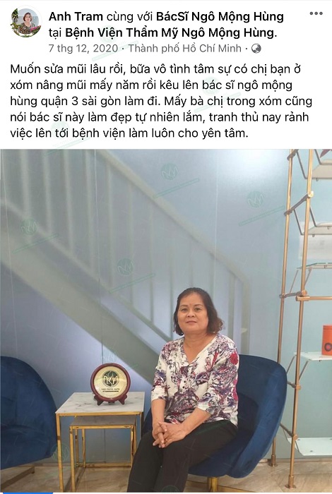 - Chăm sóc hậu phẫu: BVTM Ngô Mộng Hùng có chế độ chăm sóc, tái khám tận tình giúp mũi nhanh lành và đạt kết quả tối ưu.